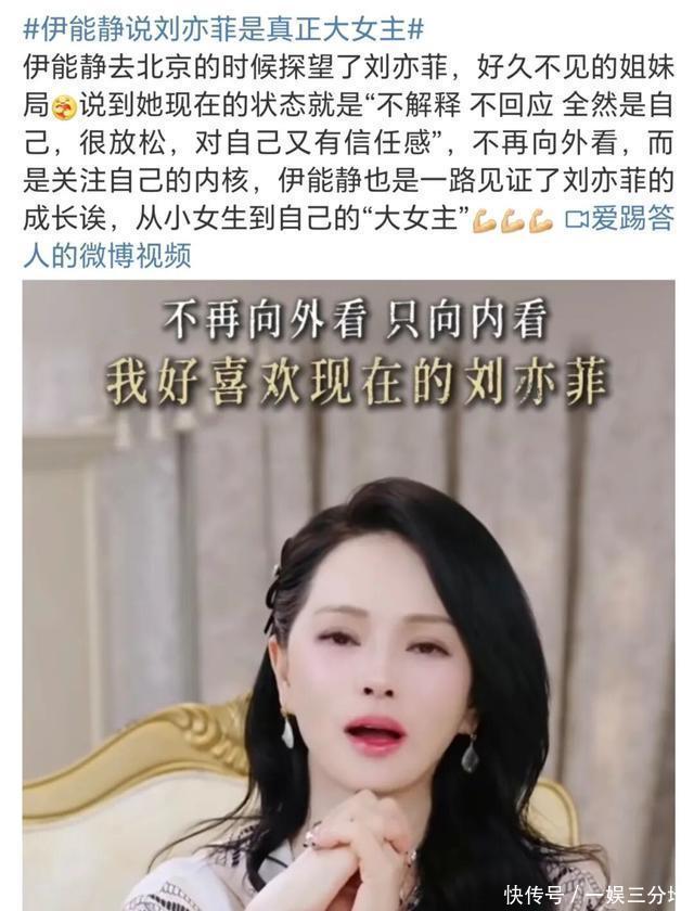 最近#伊能静说刘亦菲是真正大女主#登上了热搜,伊能静说:“我真的好喜欢现在的她,她就是那种不解释,不回应,她就是全然的是自己,她很有底气,对自己有信任感。”